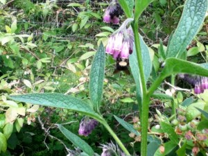 Bumblebee pollinating Comfrey blossoms. The bees work both the comfrey and the blueberry bushes that the comfrey hides from the birds.