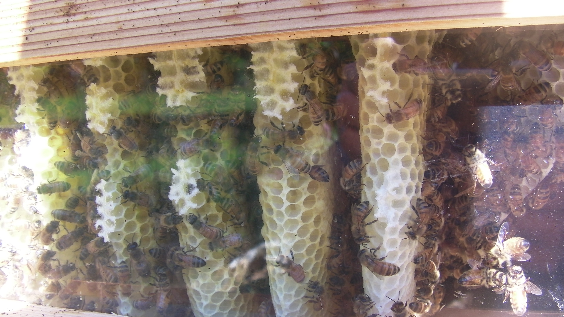 Bee Beard as seen through the observation window 10-8-12. Bee-built tunnels provide access to the honey.