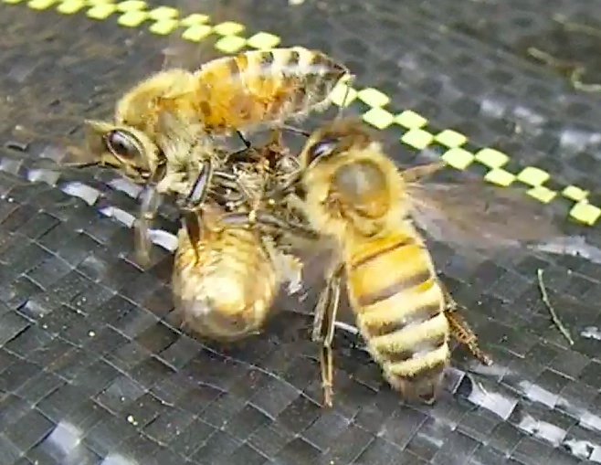 April 1, 2013…I was filming the bees at the entrance when I heard a thump on the landscape cloth. Two bees were evicting one with Deformed Wing Virus