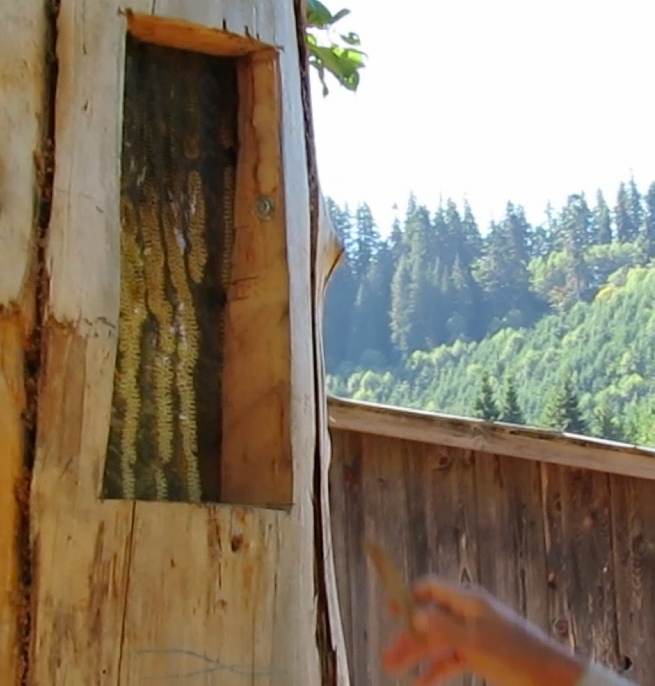 While visiting the 113 year old Gearhart ranch last week I had the occasion to ask LG, (the owner of the log hive) if he would show us the #2 log hive that Hal built for him last year.