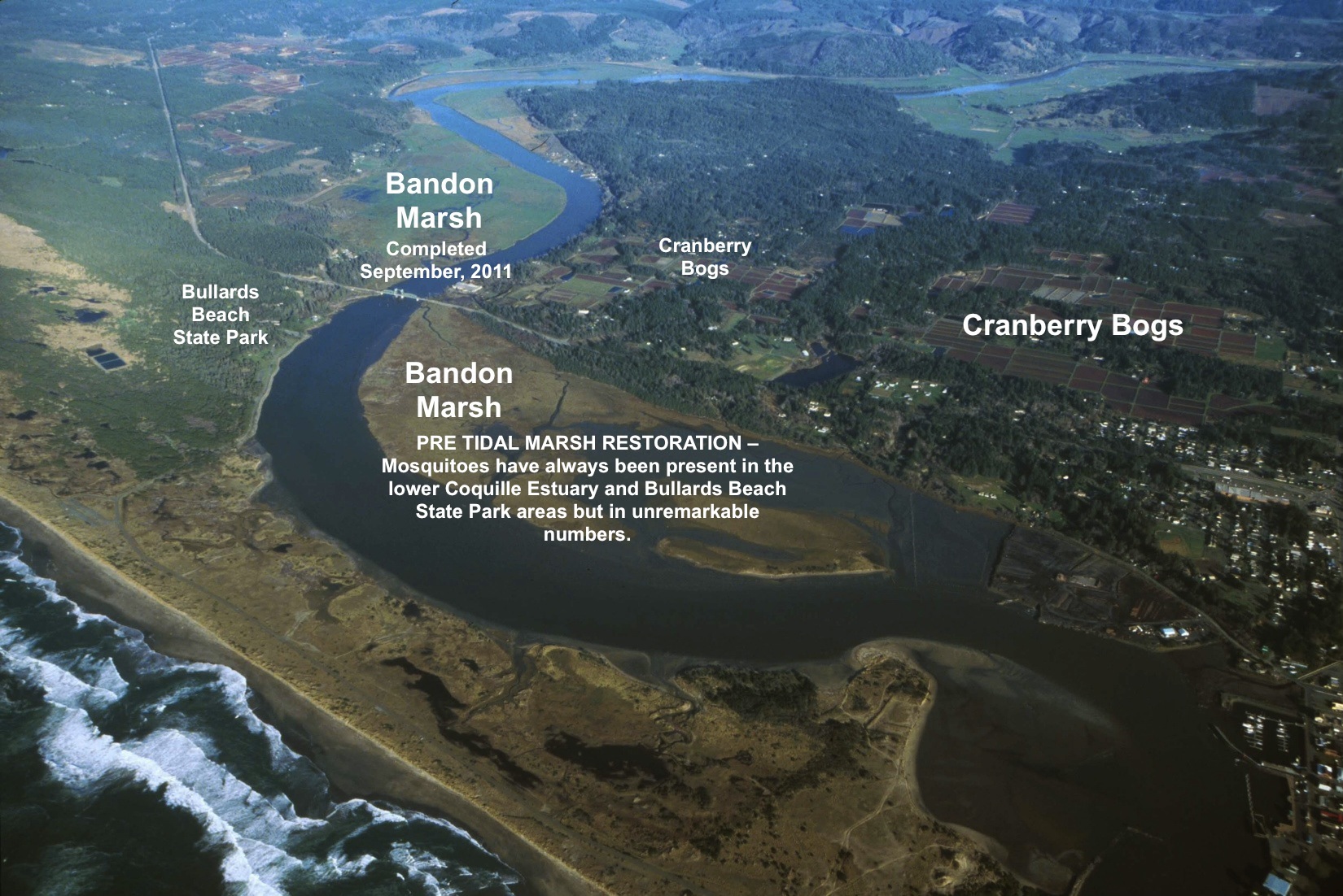 Aerial map of Bandon Marsh showing close proximetry of cranberry bogs, Bullards Beach State Park, and lower Coquille Estuary. Photo courtesy of National Scenic Byways Online (www.byways.org)