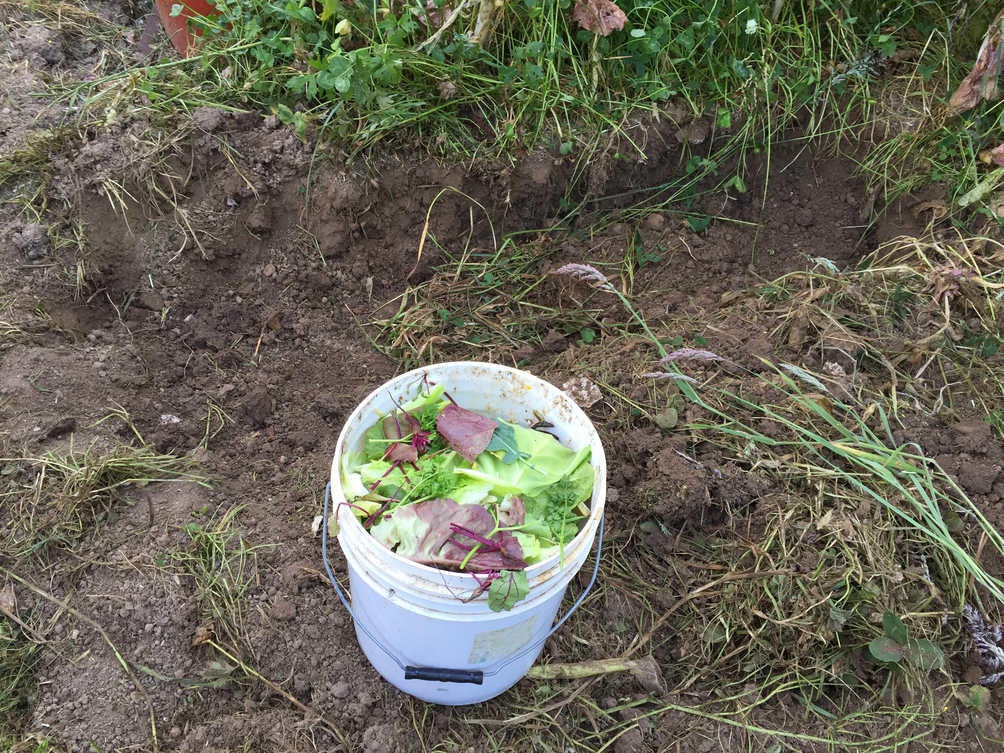 I had to get the trench dug and bury the crab shell before work. Crab shell doesn’t keep very long before getting really rank. It’s in the bin in the wheelbarrow. A tire is weighing down the lid to keep the raccoons out of it. You don’t want raccoons to make a mess of things. Uh, they will if it’s not protected.