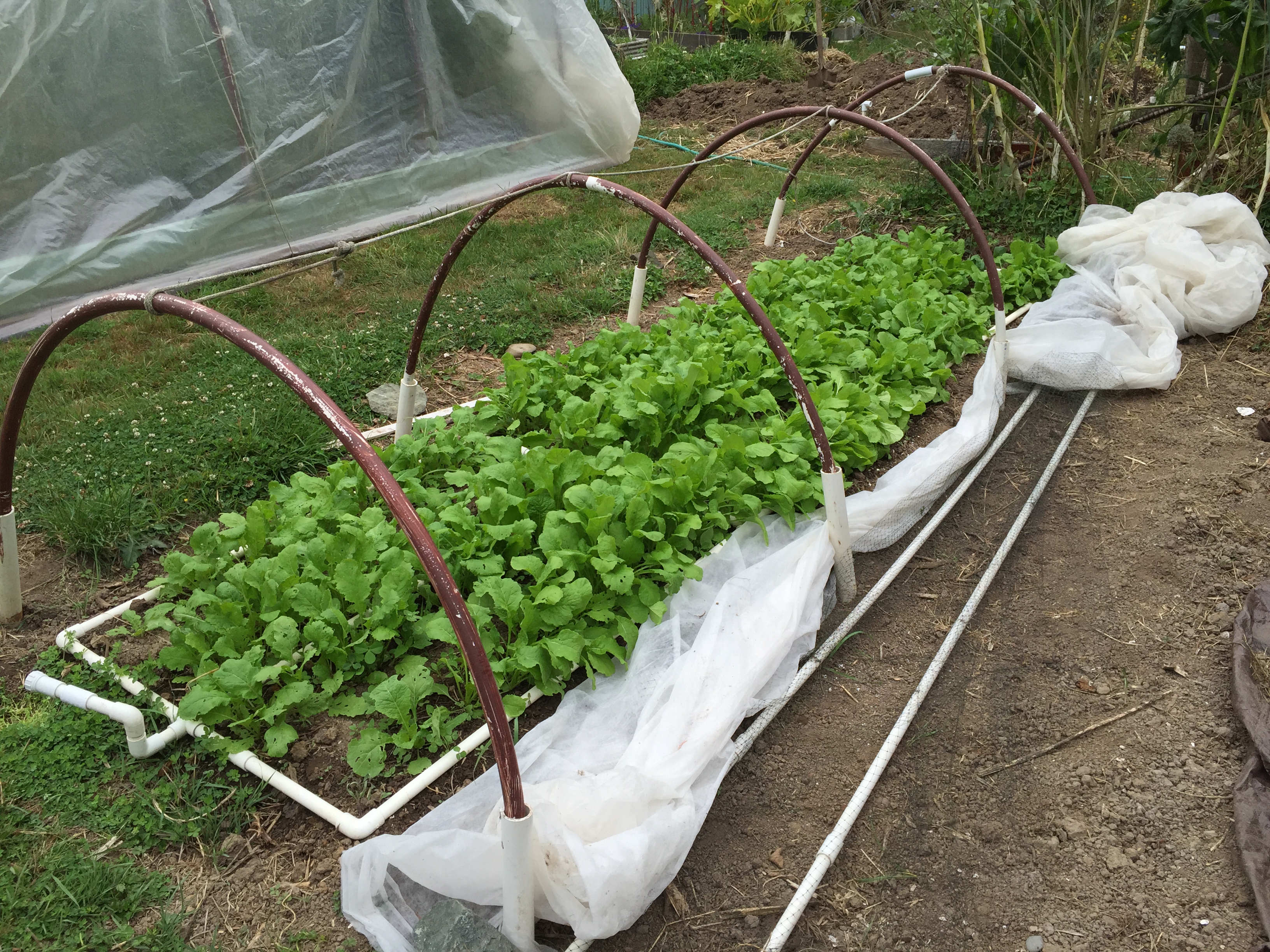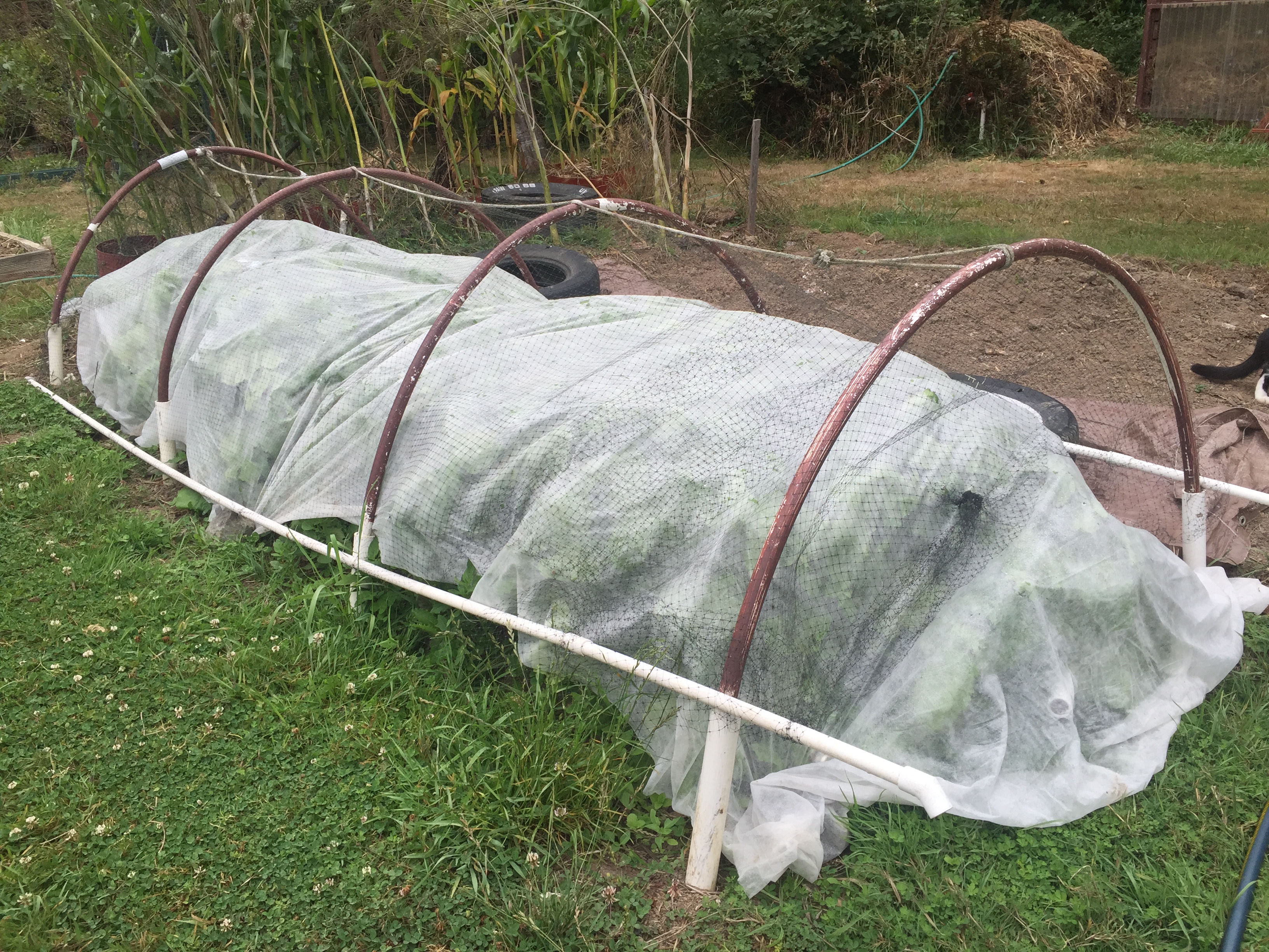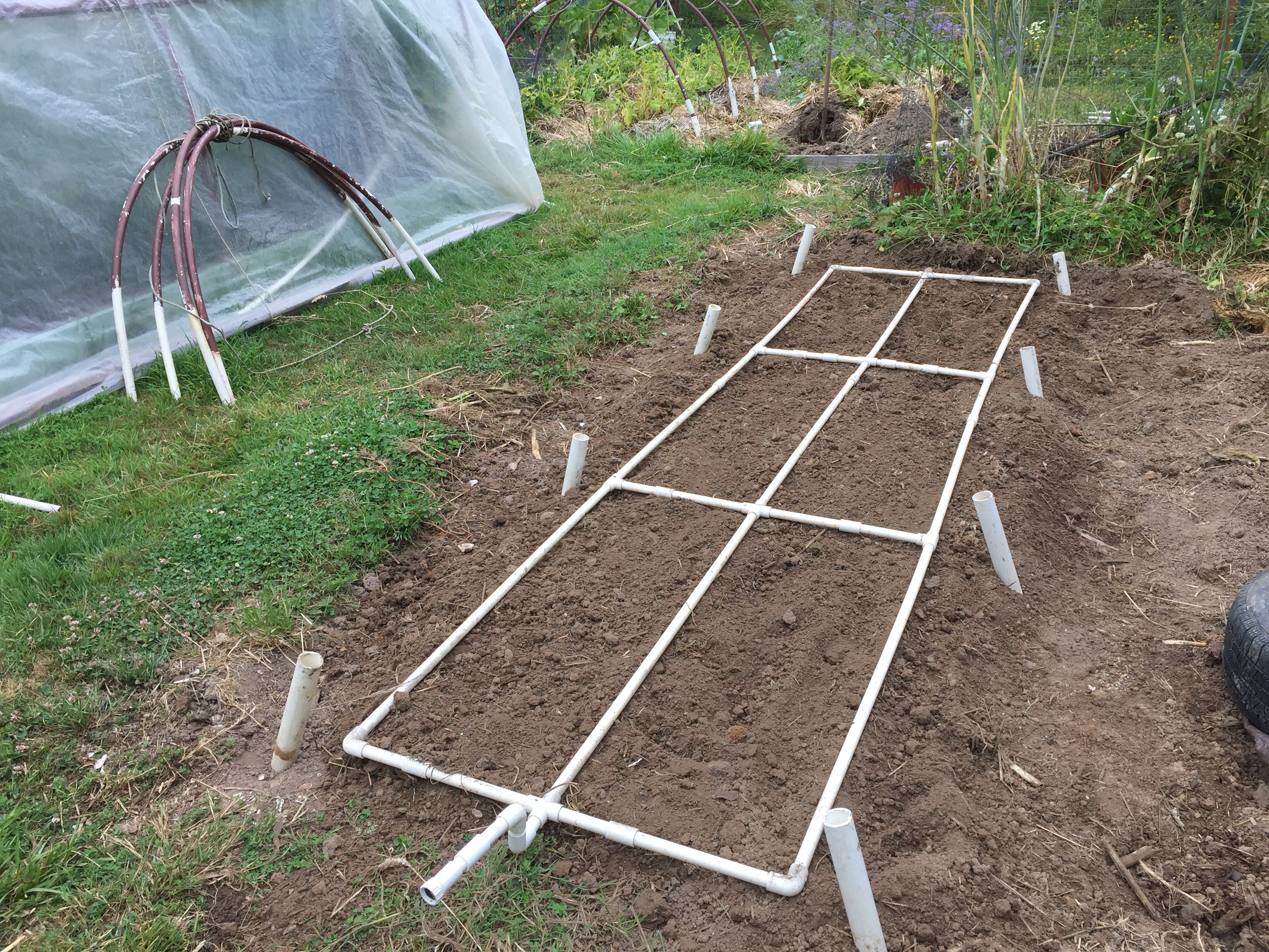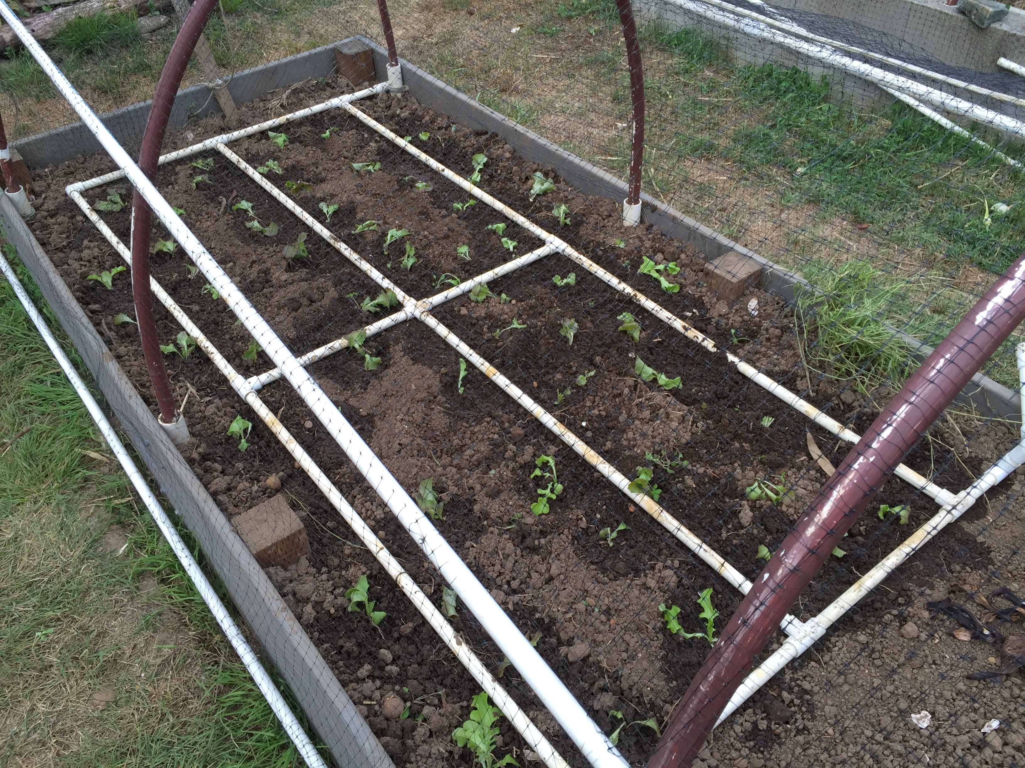 August 27…The lettuce transplants on the upper left have the dried banana peel under them. On the lower right, no banana peel. PVC water grid in place, deer netting over the top, we will see what happens. I forgot to mention the heaps of fresh crab shell that were buried here last week.