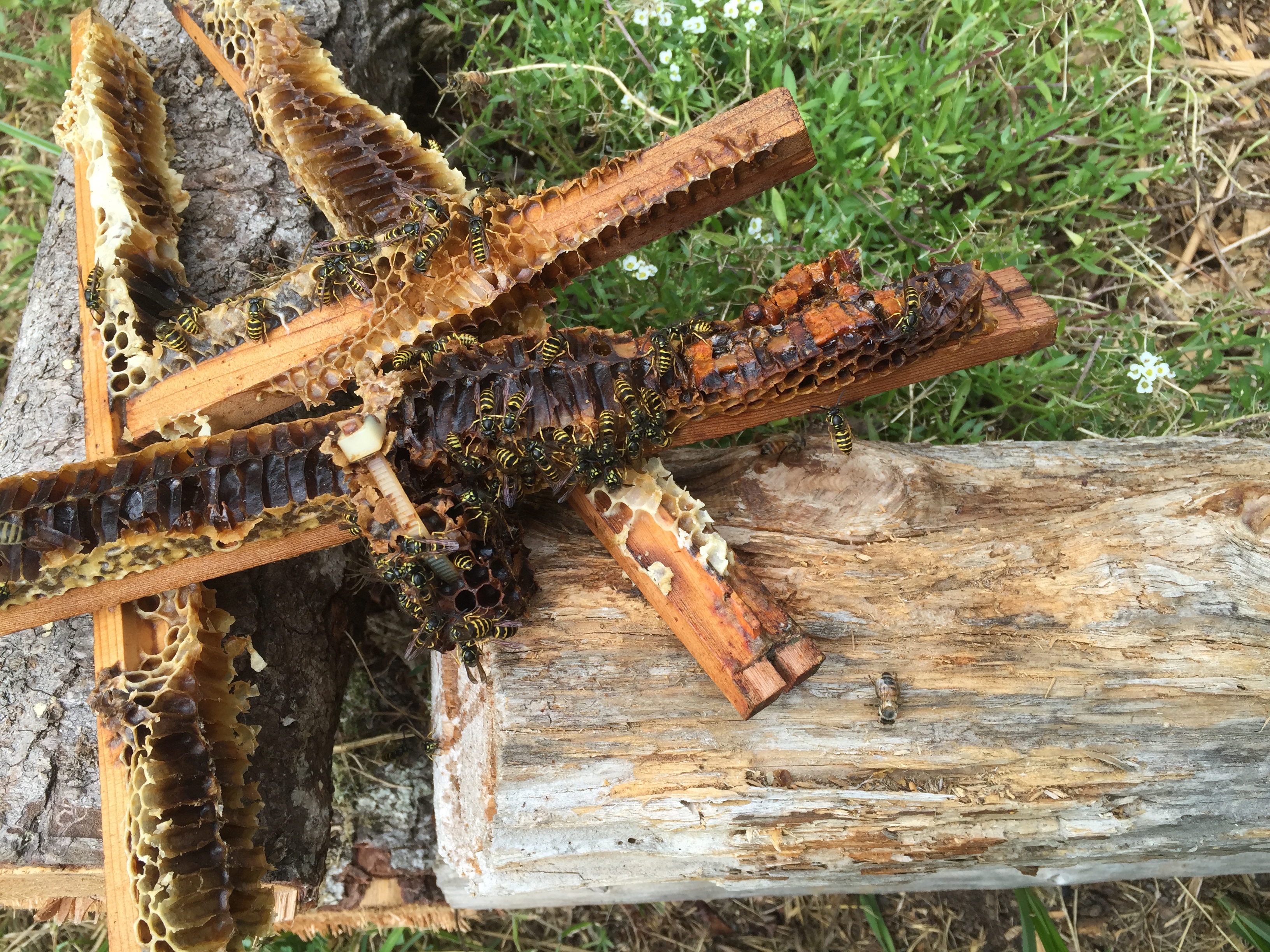 After removing most of the comb, I put these top bars out for the bees to clean them off, but where are the bees? These are all wasps!