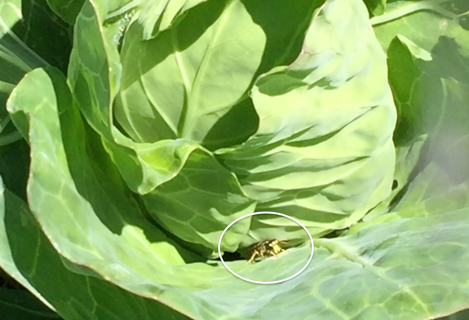 July 8…We won’t be killing the wasp nest. Wasps are good for the garden. My wife spotted this wasp flying into the cabbage to rid us of the cabbage worm. We haven’t seen ANY this year. In years’ past, we would have to painstakingly pull little green worms off the seedlings. The wasps didn’t kill my bee hives…they just took advantage after the bees had died out.