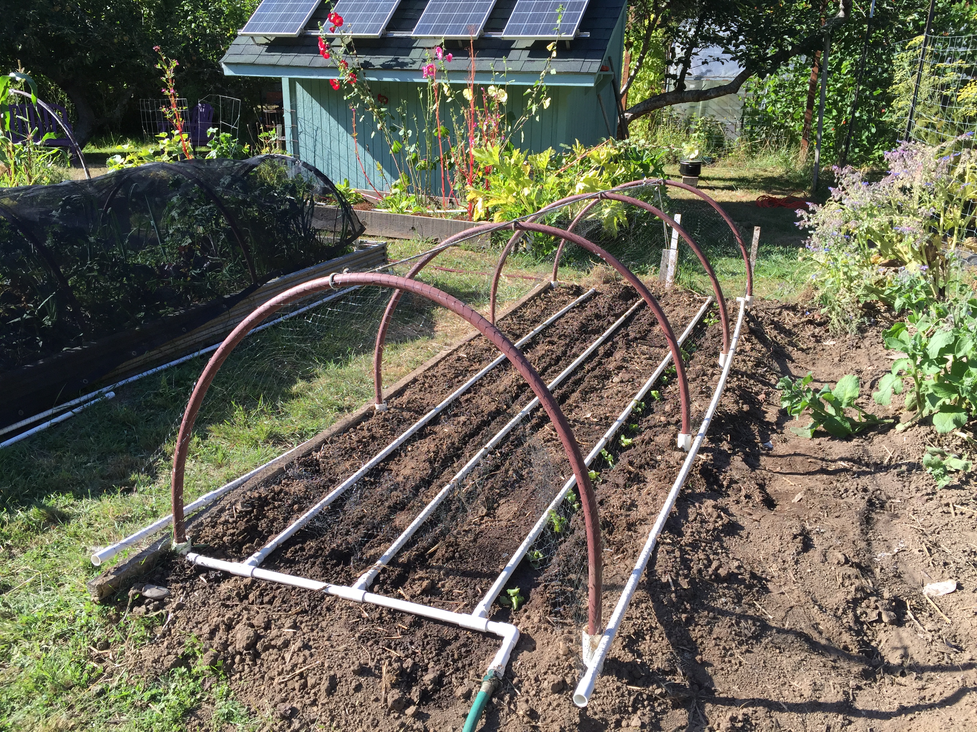 Planted 4 days after burying crab shell, hoops up, deer netting on, let’s watch you grow. 🙂