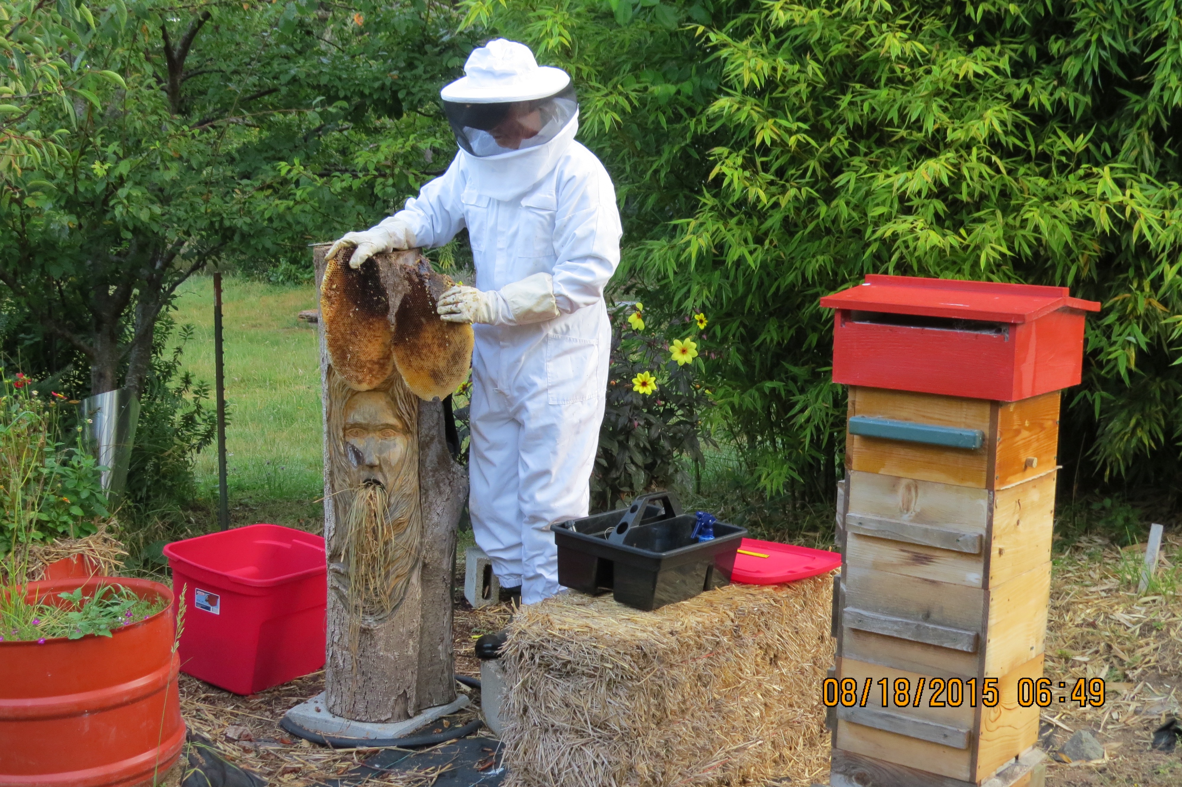 Bee-atrice log hive…Looking through the observation window, we see the final indignation…wasps are roaming at will inside. We must remove the comb. I won’t kill the wasps, but I don’t want to grow their numbers by feeding them honey.