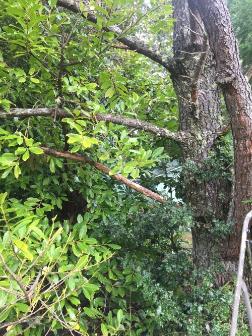 SSince a tree hive seems to last the longest, I’ve decided to try another one. I’ve got to do some trimming around it, but this will be the location for the next one. Actually the horizontal limb I’m looking at here is not going to work. The hive will be secured to the limb to the extreme right of the photo. It’ll hold Warré sized bars, but it’s too heavy to lug around for a bait hive, so I’m stuck with trying to attract a swarm.