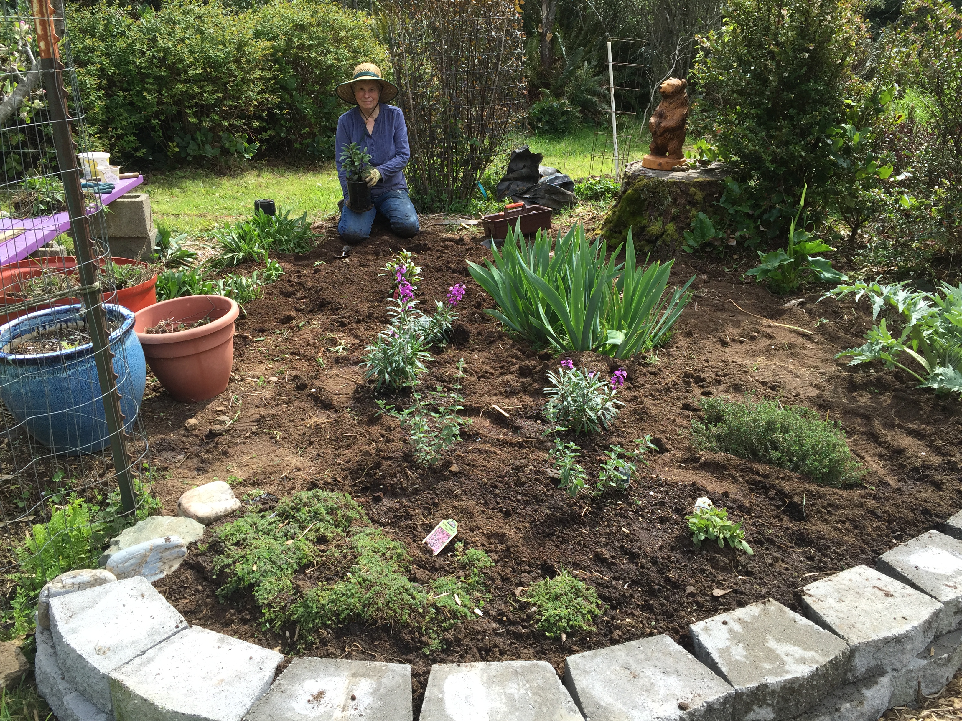 My wife is very happy about the deer fence. It means she can plant some bee-loving flowers without the deer munching them. She’s planting some……in our baby bear bed. Once the fence is totally up, we will remove the cages around the fruit trees and Nine Barks.