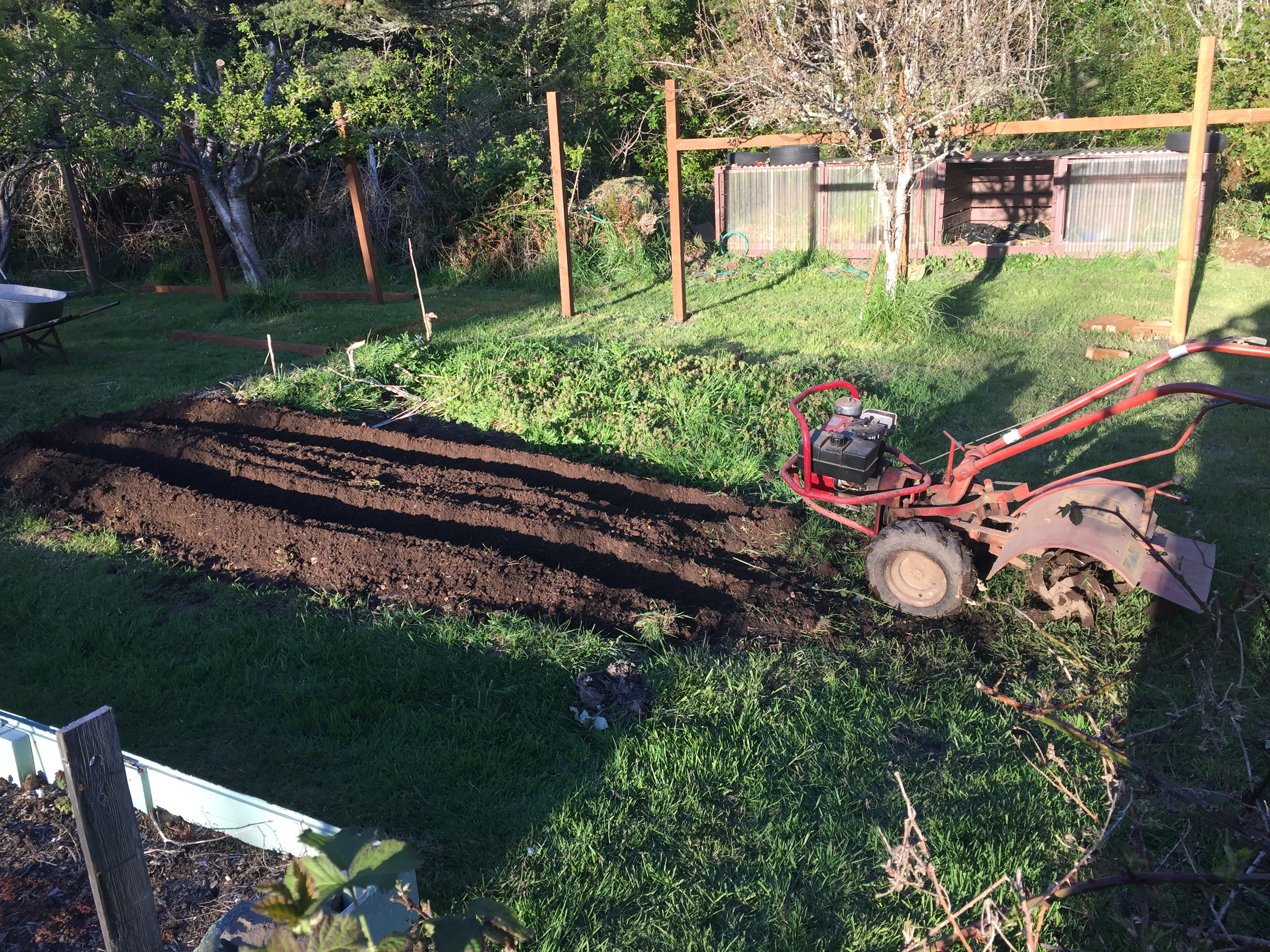It ain’t purty, but this 40 year-old Troy-bilt rototiller still starts on the second pull. I tilled up a couple of early rows for potatoes. You can see the 4×4’s of the deer fence in the background.