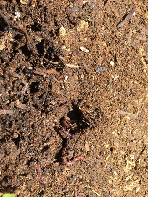 Bee Beard Log Hive Gets a New Hat » 2812 Earthworms in deep litter, Bee Beard, 4-20-16