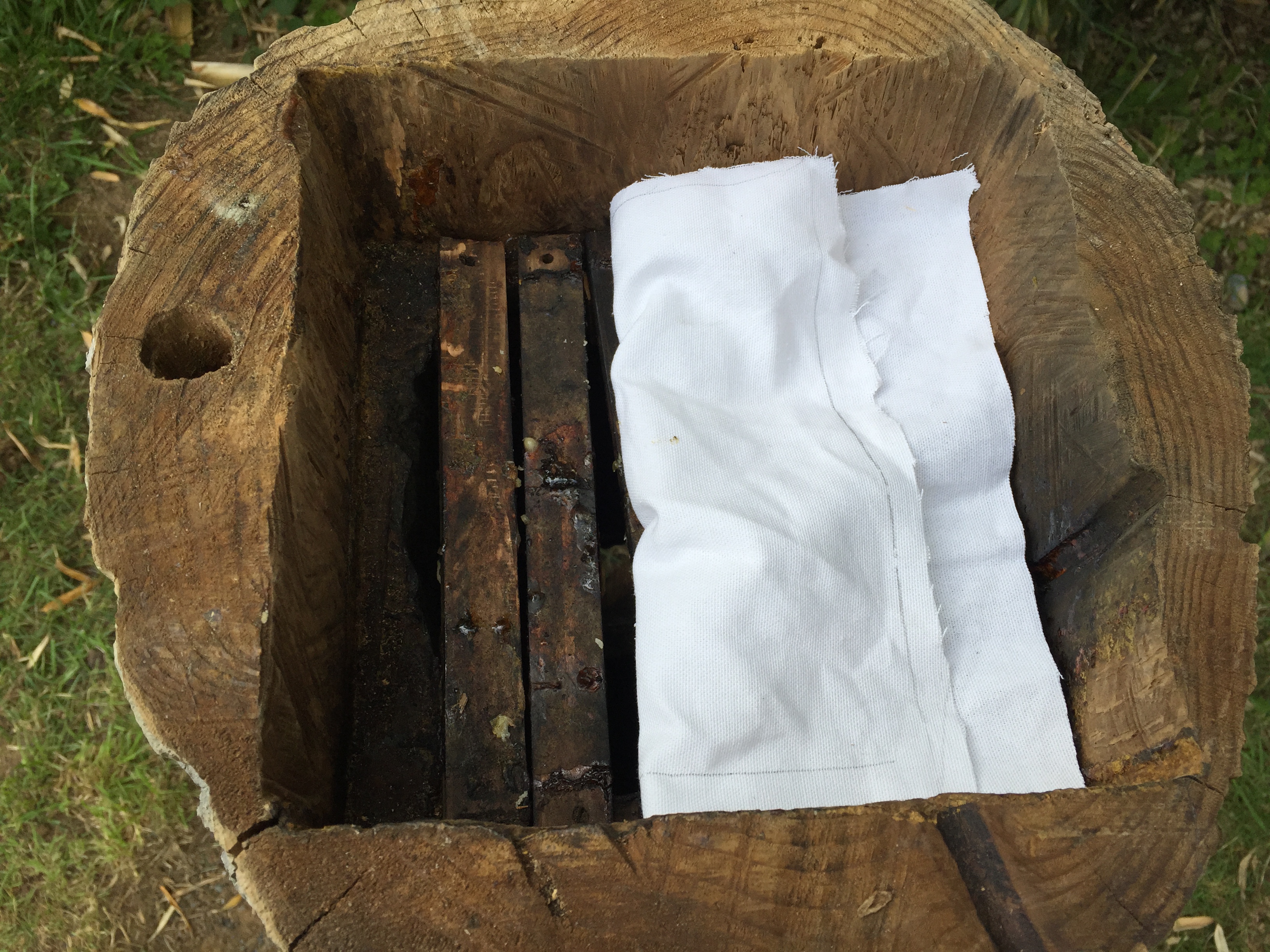 Bee Beard Log Hive Gets a New Hat » 2823 Quilt over scorched top bars, 4-20-16