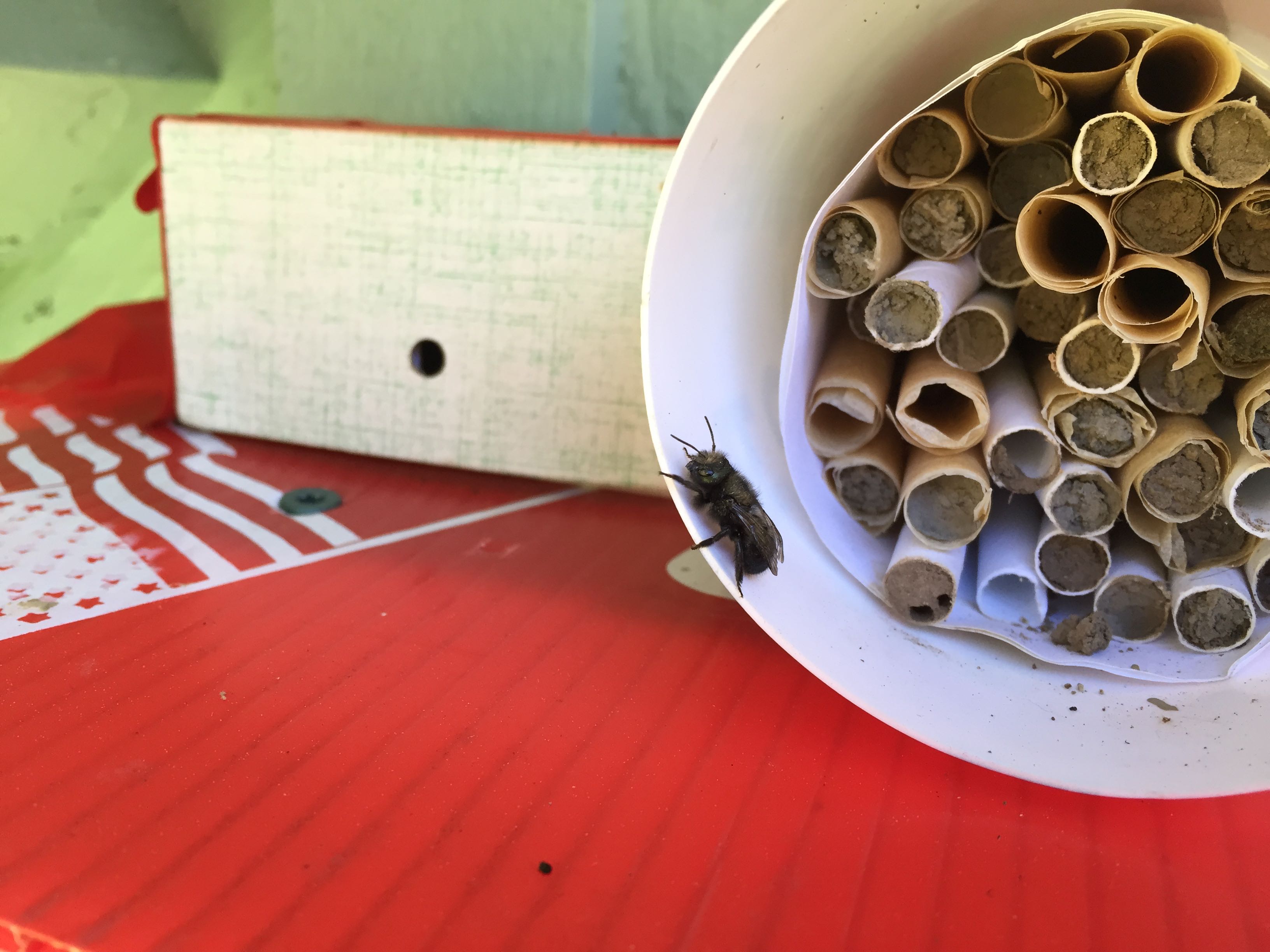 Finally on March 28, I see a bee. This must be a male. Males have long antenna. They usually emerge first because they are laid last in the tubes (being expendable.) Predators will be able to reach them easily. 😦