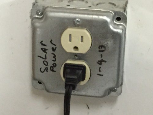 Solar power plug installed 1 January 2013 (into my press room) Before that, I used a long extension cord from the panels through the shop window. 🙂