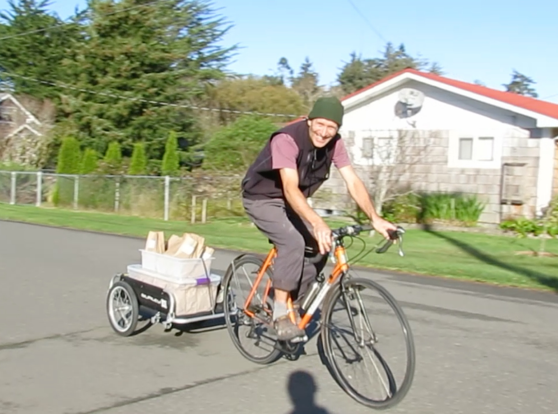 At about 9:30 am, fresh bread gets delivered by bicycle to the natural foods store.