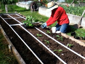 After watching a video about extended season gardening about 15 years ago,  my wife and I decided to try it out.  We had to make a few adjustments to keep the tents from blowing down in the wind.  By strapping 1.25″ pvc to the inside of the wood we can adjust the height of the hoops…one year we’ll have short hoops for greens, the next year we’ll have tall hoops for tomatoes.