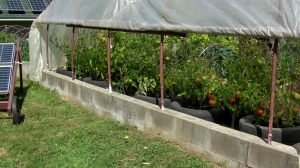 Clear plastic over hoops, held up by rope and the re-enforcement wood.  Why have ‘tents?’  Our night time temperatures will dip to 45 deg. F (7 deg. c)  even in the middle of summer.  Use 6 mil UV stable greenhouse film. It’ll last for years of opening and closing every day.  We like our tomatoes to be warm and happy.