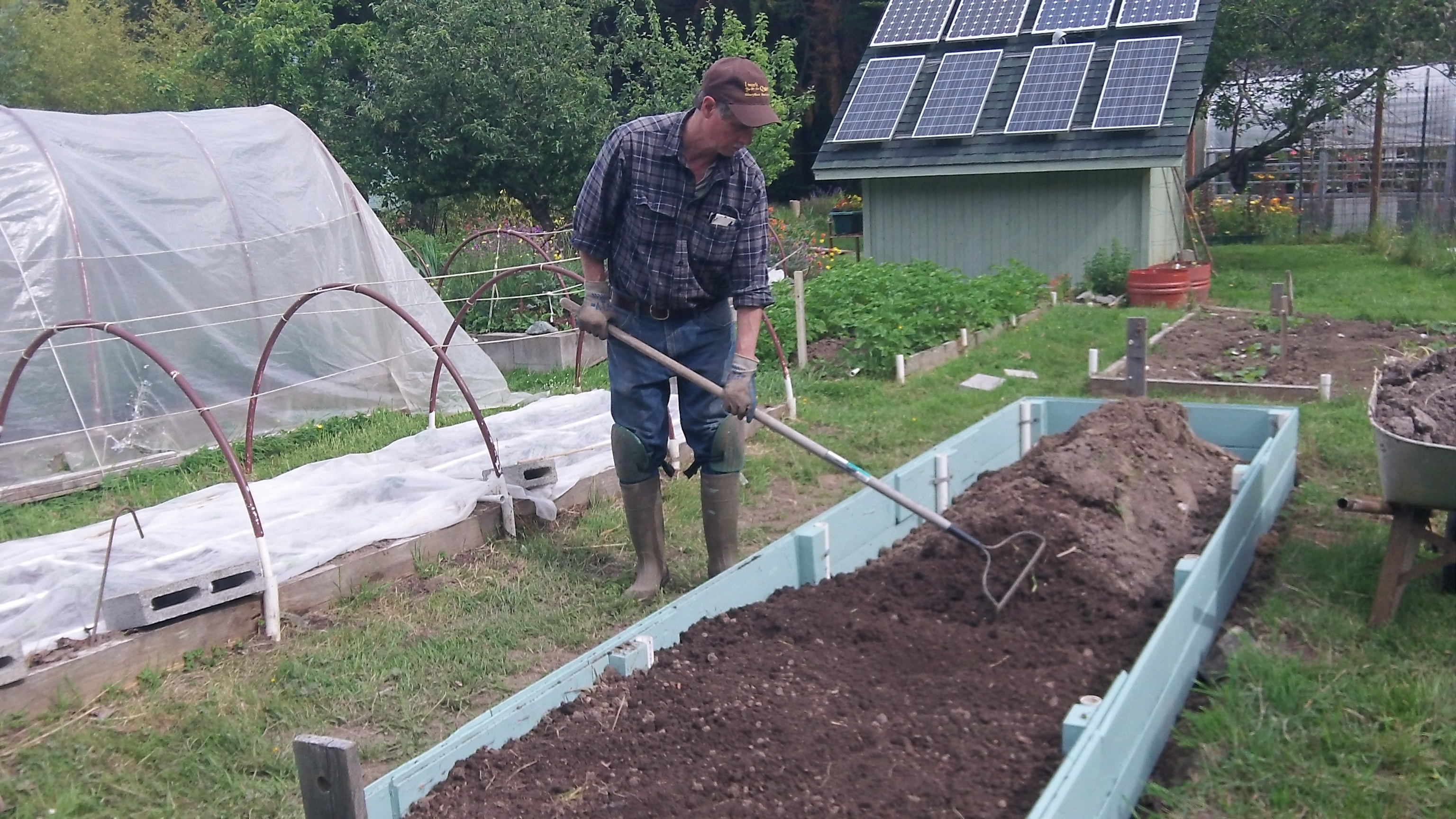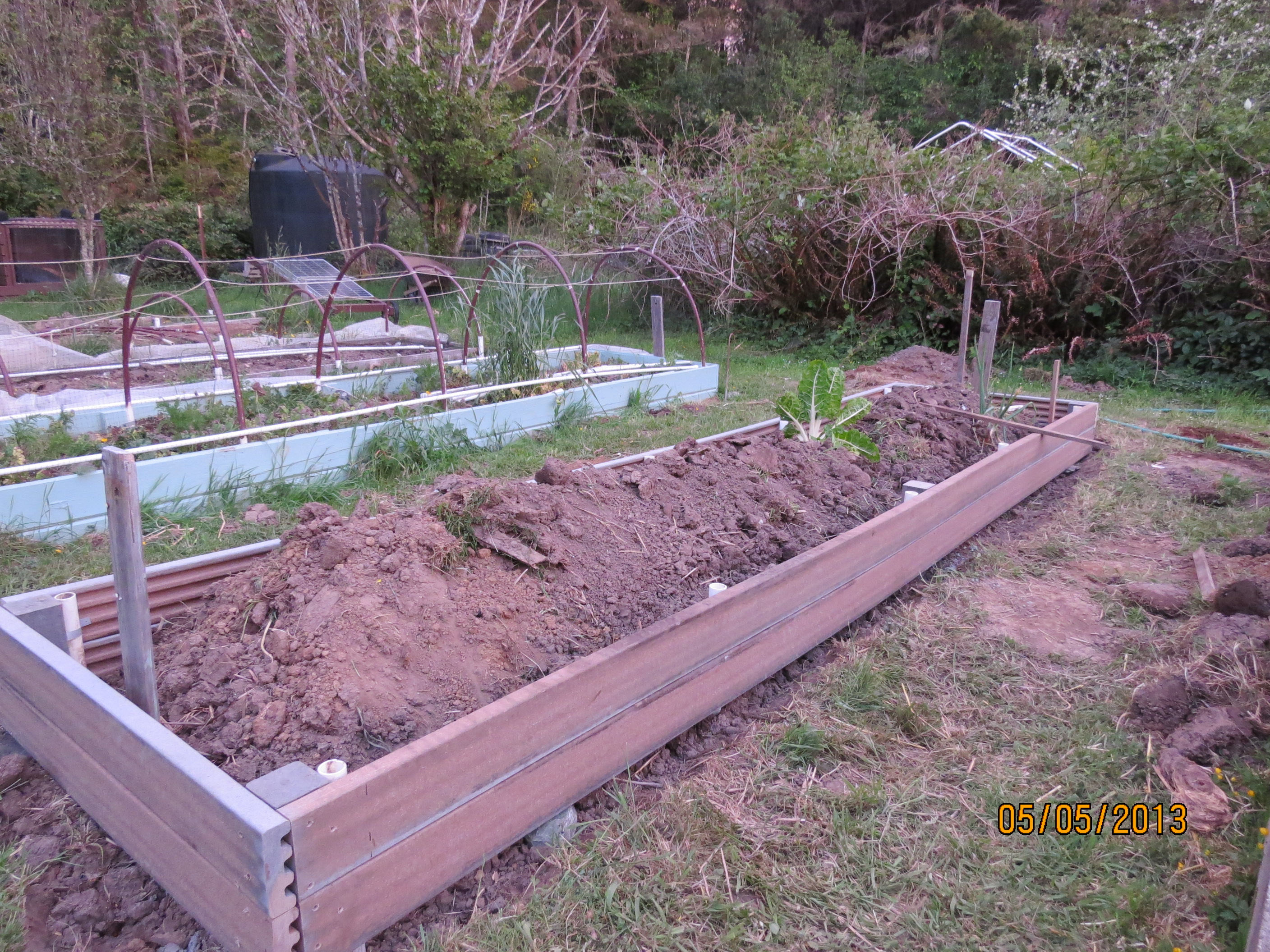 We built most of our raised beds in 1996 and ’97.  The lumber came from a small sawmill using white cedar that had been passed over by the big timber companies.  It was sawn to a full 2 x 10 x 16′ (5.08 cm x 25.4 cm x 4.87 m)  It was beautiful wood.  We had less personal time then but more energy…lots more.  As good as that wood was, it still rots when in contact with the soil.  So after 17 years all those 16 beds have got to be replaced.  We found this decking material on close-out.  It’s not cheap but is supposed to outlast wood.  It’s a little wobbly so I had to set the corners in concrete, but if it outlasts wood, it’ll be worth it.  We’re trying to replace ONE raised bed a year now.  The green one was built last year out of old siding…much cheaper than this one, but won’t last as long.