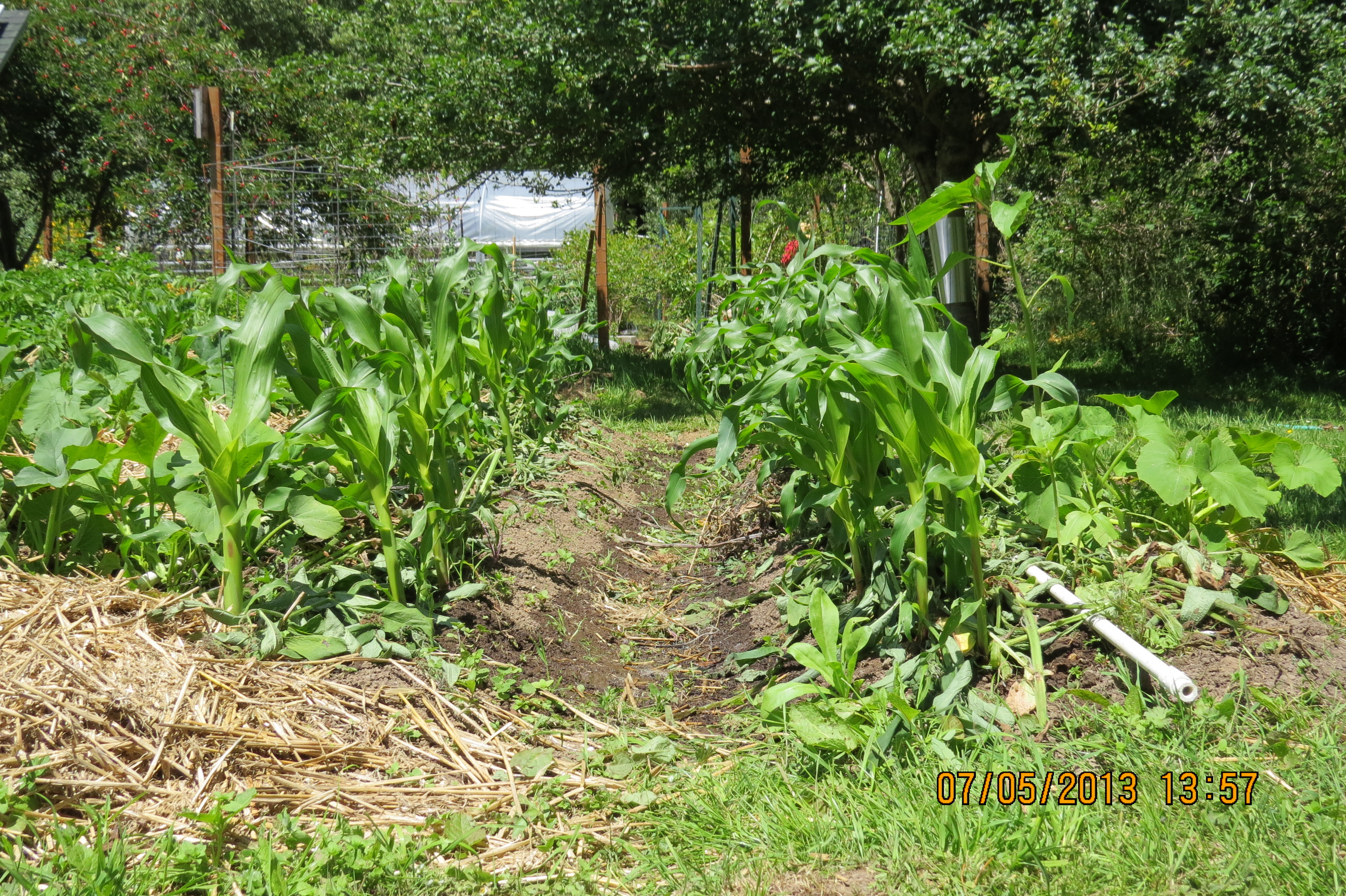July 6, 2013...Squash and corn growing well after mulch added to keep soil from drying out.