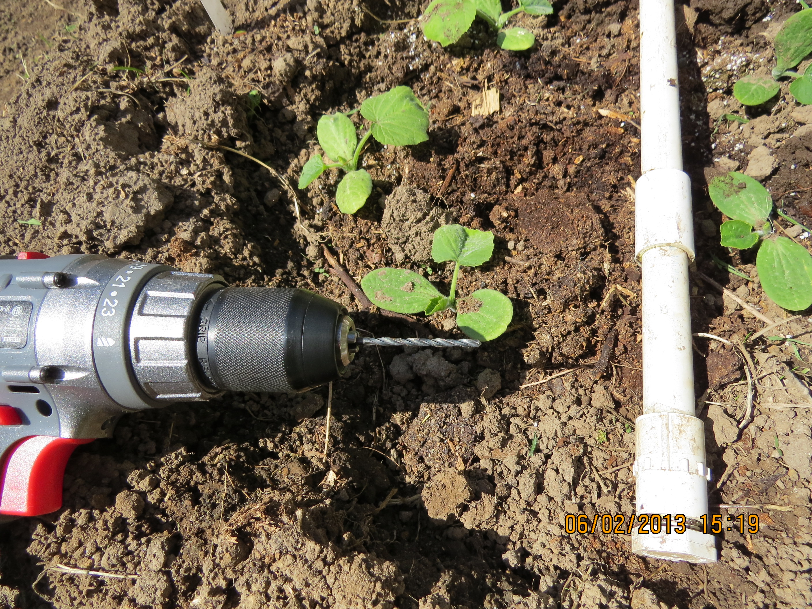 I added two drip watering grids by using 8′ (2,44 m) pieces of pvc.  The joints do not have to be glued because with all the holes drilled in them, they won’t leak.   I drilled the holes about 6″ apart (15 cm) on each side and then plant where the water comes through.