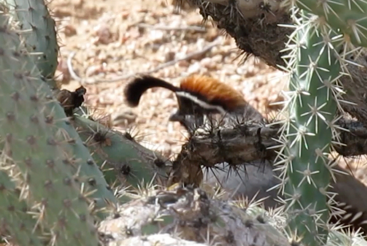 Gambel’s Quail hiding. They run fast out in the open, then hide under some cactus. On the video you can see it run between hiding spots.