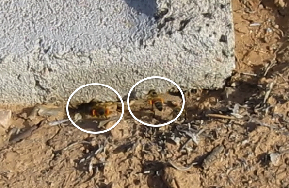 I asked the fence installers where I could find honeybees? They pointed to a broken cinder block that I had just about stepped on. There was my first sighting of bees.