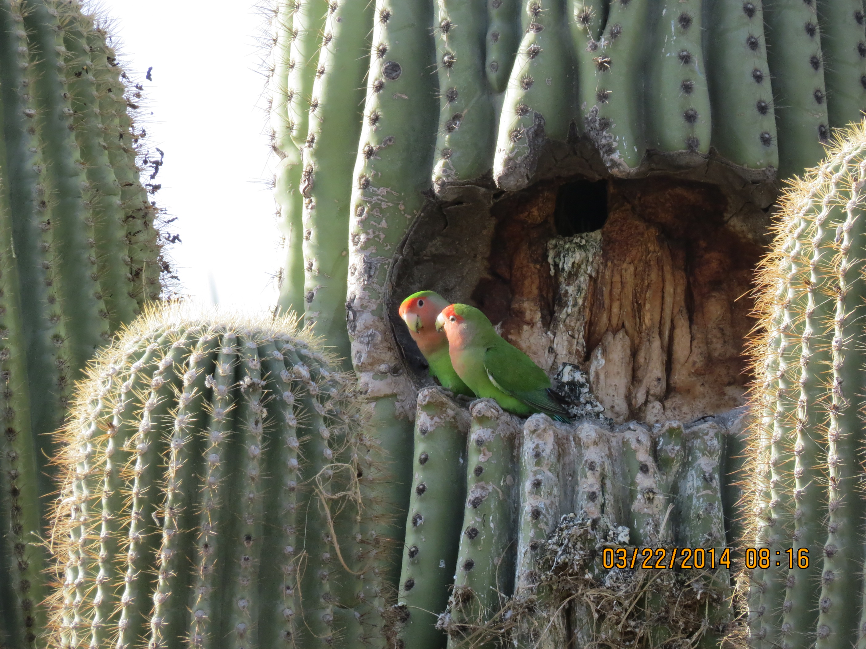 In my quest for bees, I spied these two green parrots nesting in a saguaro cactus. Footnote, Lauren Harter has ID’ed these as Rosy-faced Lovebirds.