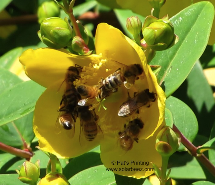 To plant, just throw some seeds into one of these planting kits. We start planting under “Grow-Lux” fluorescent lights in February or March. The four squares on the left are Hypericum, pollinated by our bees the previous year and planted from that very fine seed. If your winters aren’t too cold, you can scatter some seeds in some bare ground and see if they come up. If they grow, you’ll enjoy watching all the bees go crazy on the flowers. Note: I’ve been calling this plant a Hidcote Hypericum, but I just read that Hidcote is considered a hybrid, so I could be wrong.